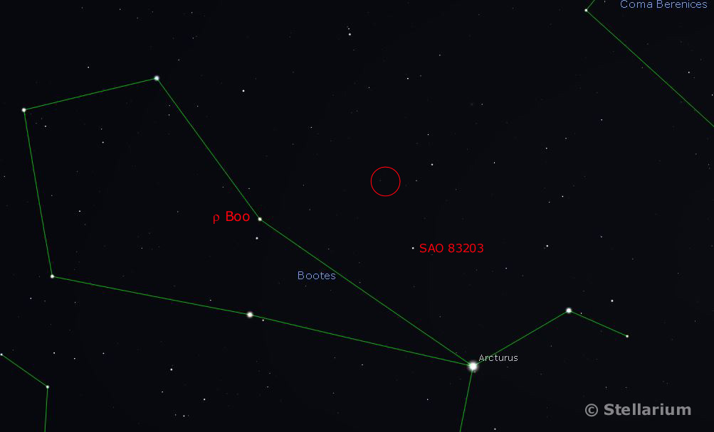 NGC5466 is located in the constellation of Bootes and can be found by triangulation from Arcturus (α Boo) and ρ Boo following the line from Arcturus (α Boo) through SAO83203.