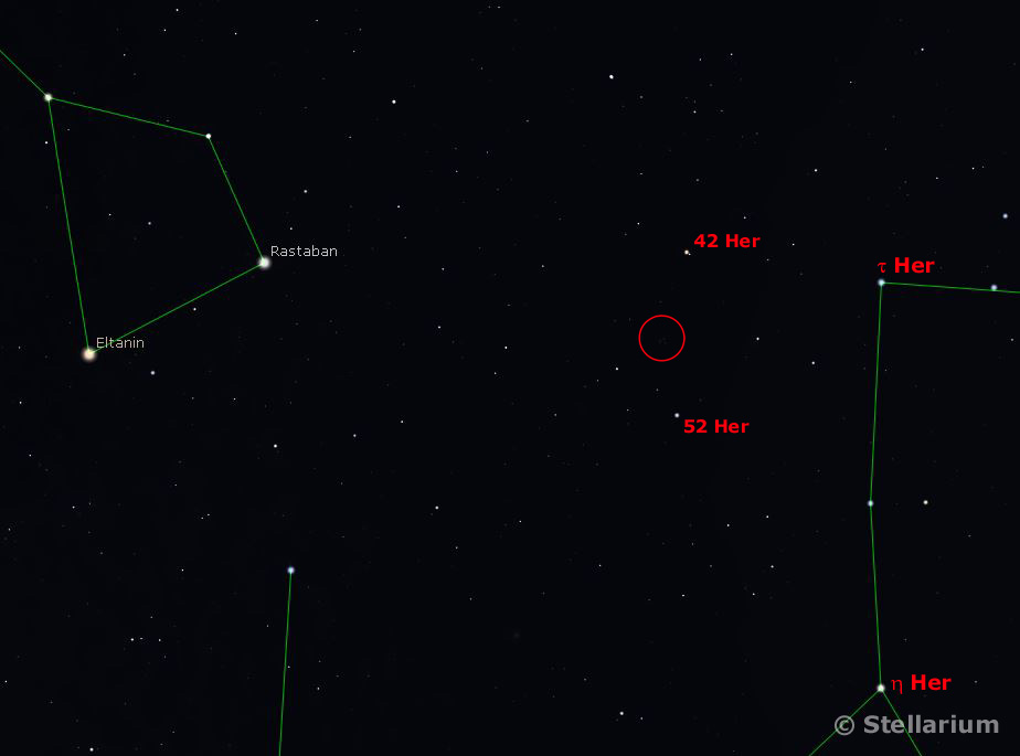 NGC6229 is located in the constellation of Hercules, between the upper right arm of Hercules and the head of Draco. Look for the midpoint between two magnitude 4.8 stars, 42 Her & 52 Her.