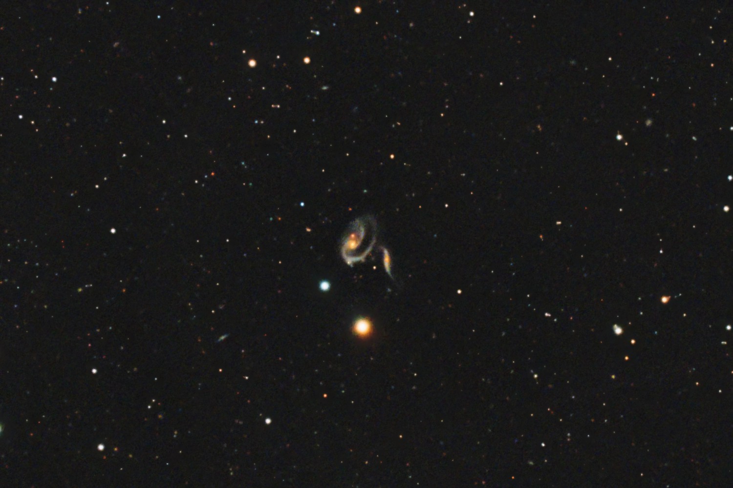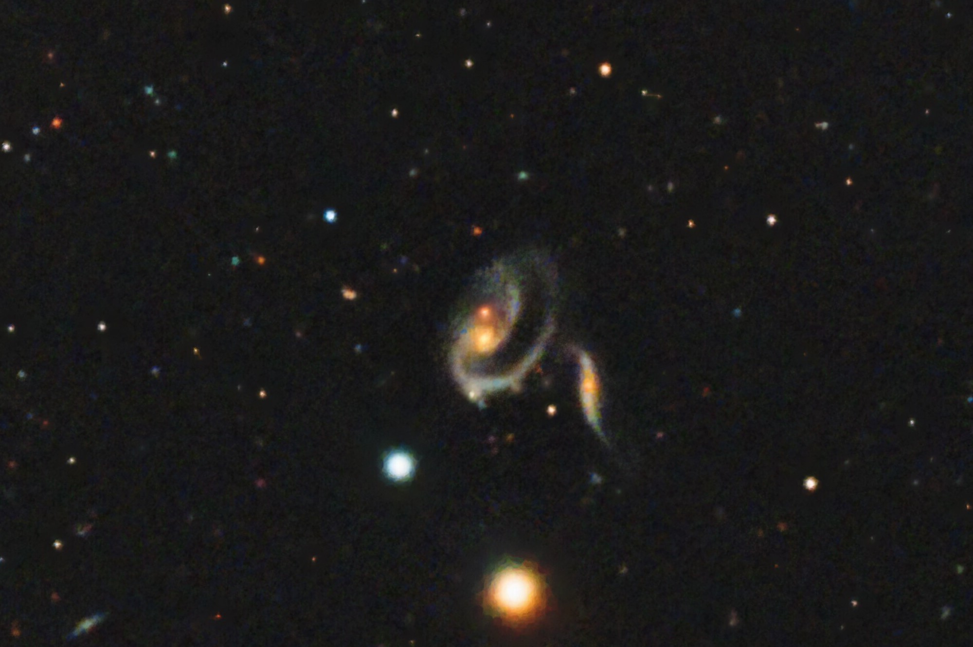 Capturing these very deep 'Deep Sky' images is quite a challenge, so hat's off to James for this distant effort. In the image you can see that the graviational attraction between the two is tidally distorting the spiral shape of UGC1810. The interaction is also known to be creating active star formation at UGC1813's nucleus.