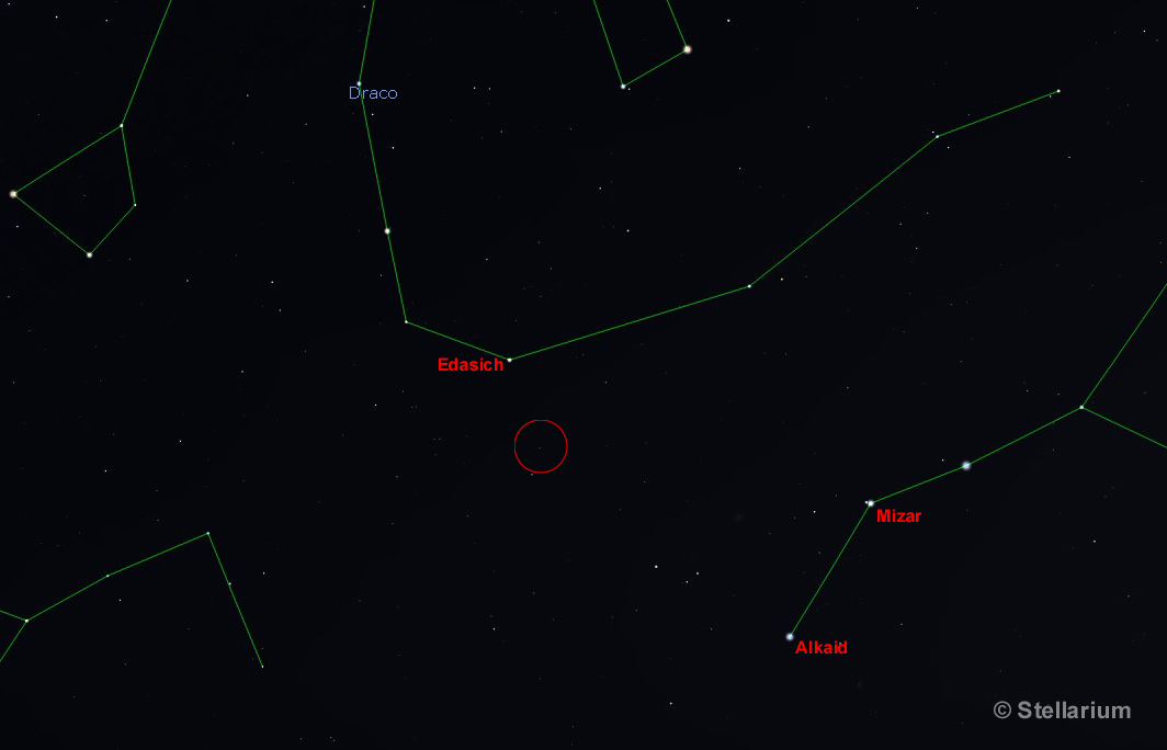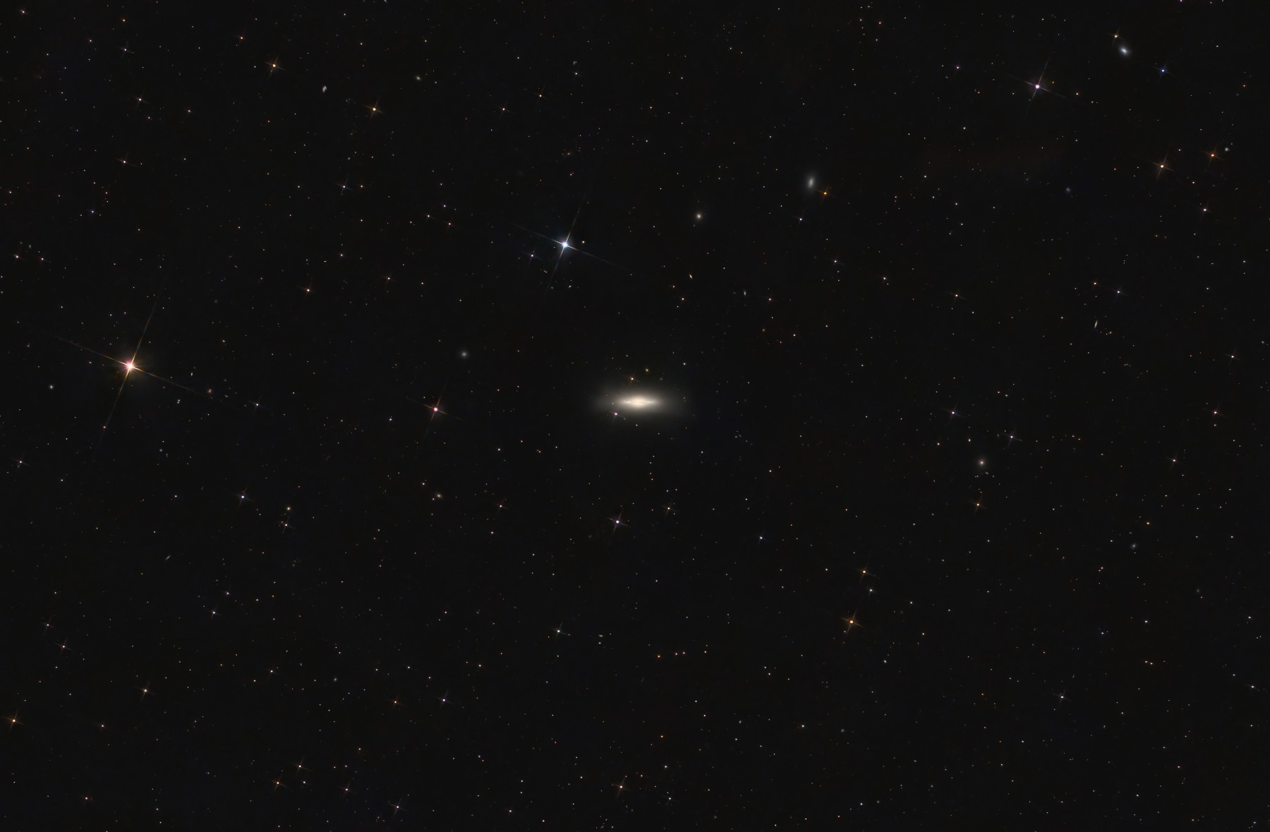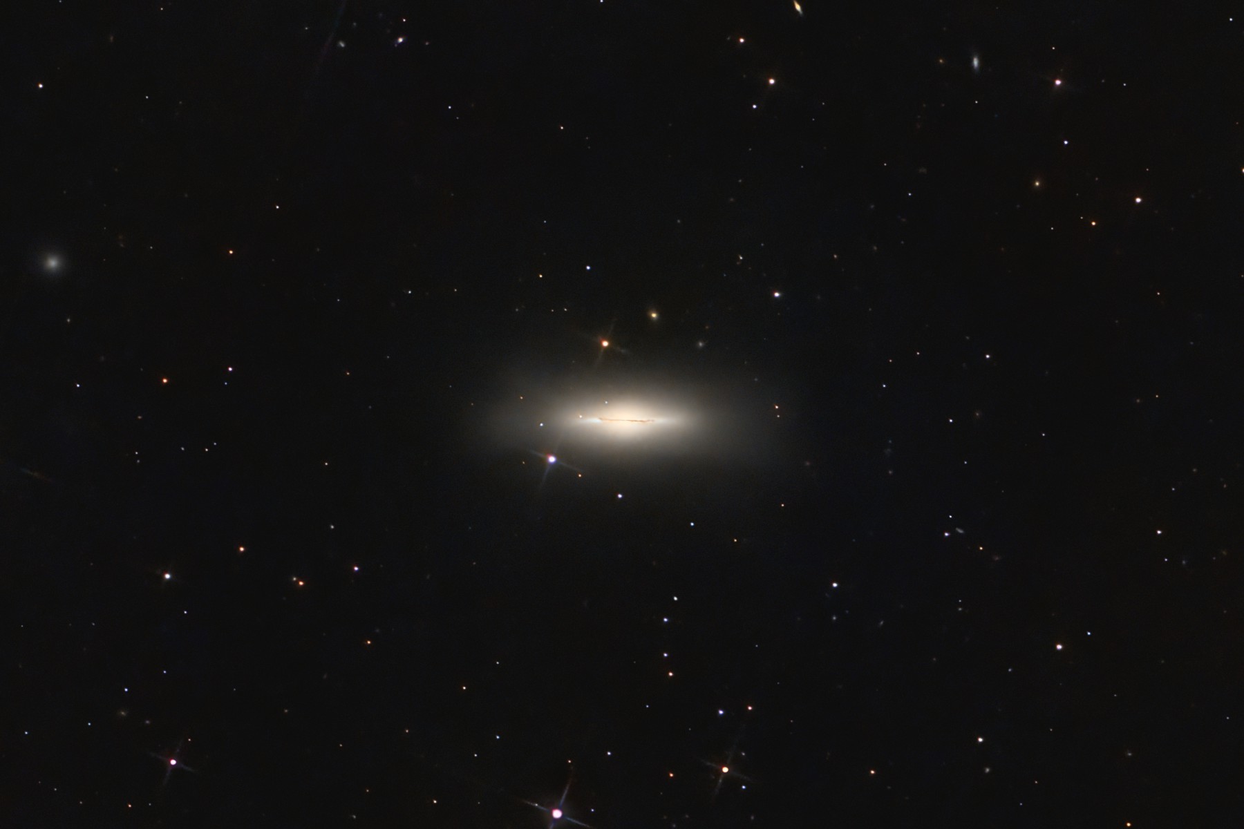 M102 - the Spindle Galaxy is a relatively bright edge-on lenticular or spiral galaxy 44 million light years away in the constellation of Draco. It is notable for the extended dust disk which is unusual for lenticular galaxies. Pierre Méchain discovered the galaxy in 1781, but he removed it from the Messier catalog two years later as he thought he'd confused it with M101. It has subsequently been reinstated in the Messier list and is also classified as NGC5866 in the 'New General Catalogue'.