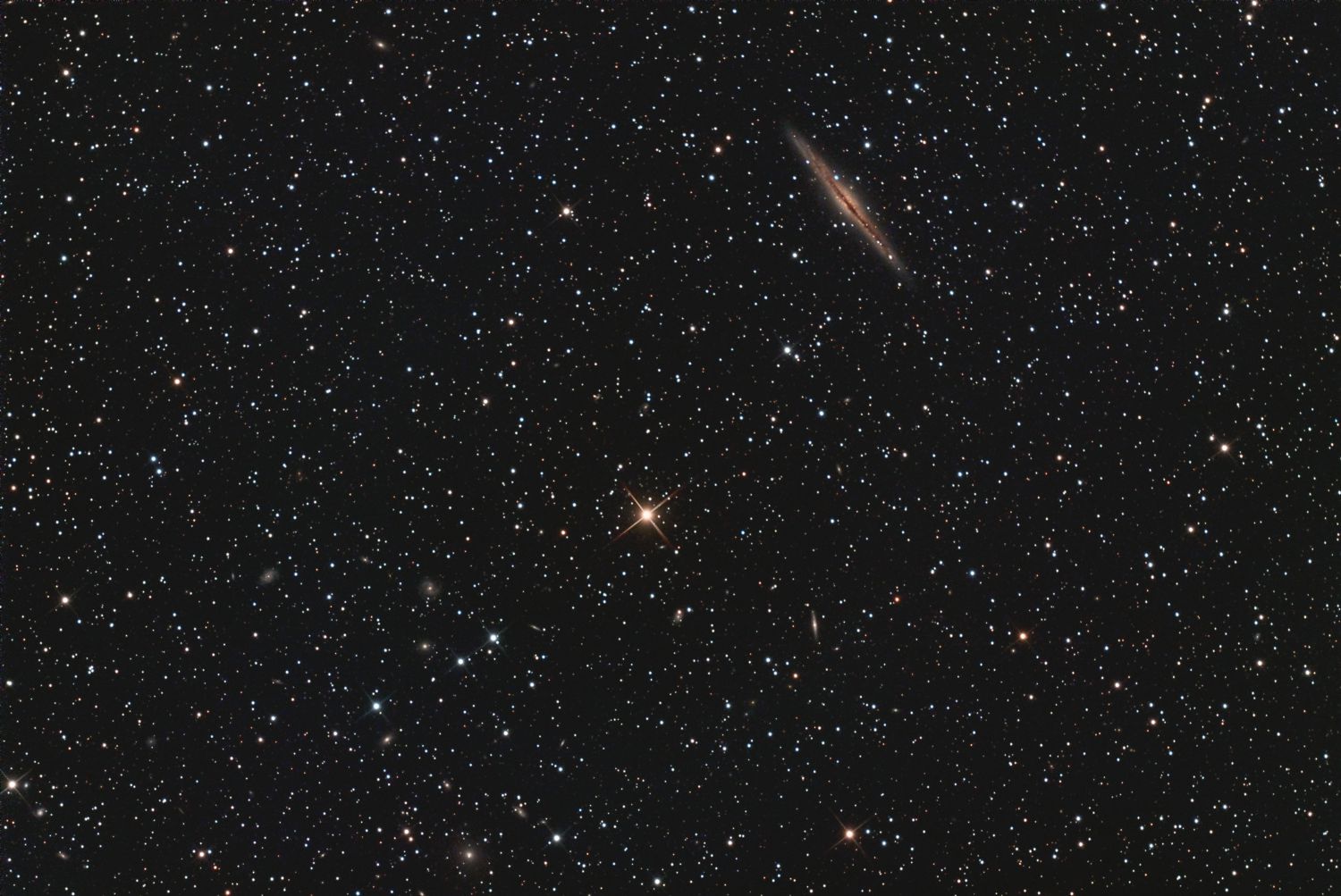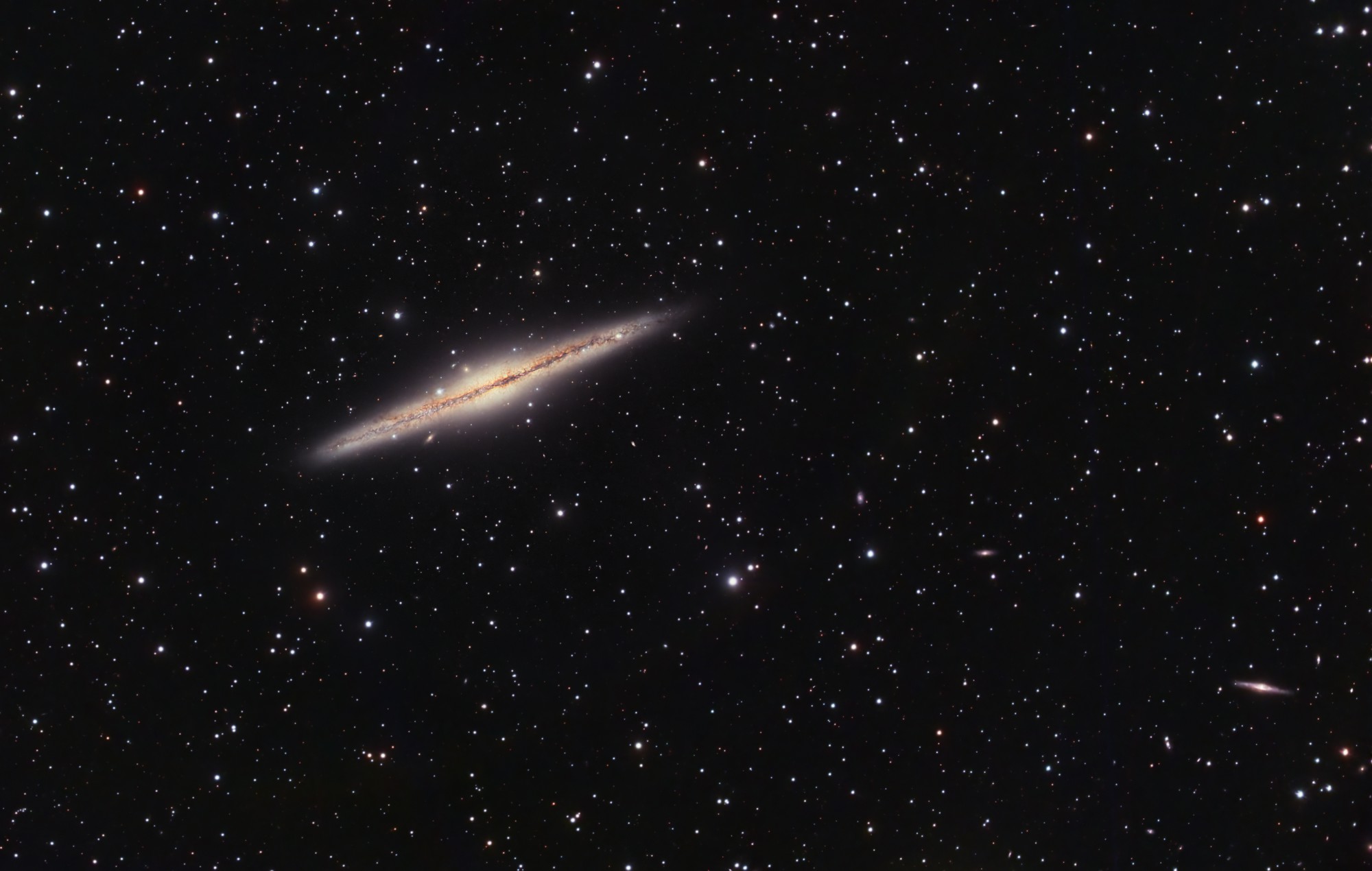 NGC891 is a spiral galaxy about 100,000 light years across & 30 million light years away in the constellation of Andromeda. From Earth it appears edge-on, with a splendid view of the dark lane of dust & gas running through its centre. The galaxy is thought to be about similar in size & luminosity to the Milky Way, and also like the Milky Way, it's thought to probably have a central bar.