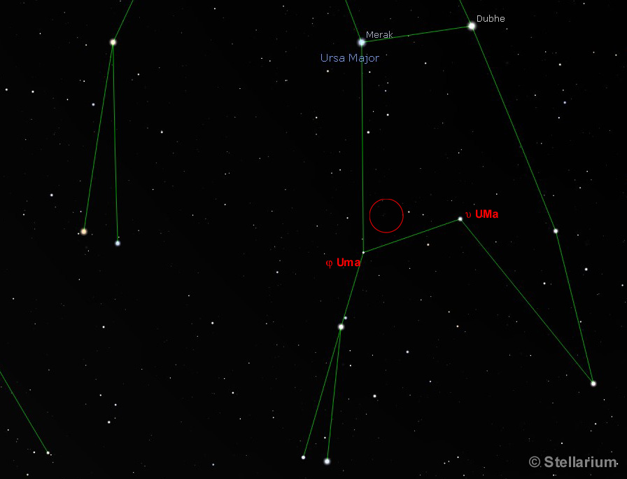 Also in the image are is the twin quasar QSO 0957+561 A/B. Although it looks just like a binary star, it is the first object to be identified as 'gravitationally lensed', which results in it appearing in double. There is a time delay of 417 days between each image and the quasar is approx. 8.7 billion light years away...
