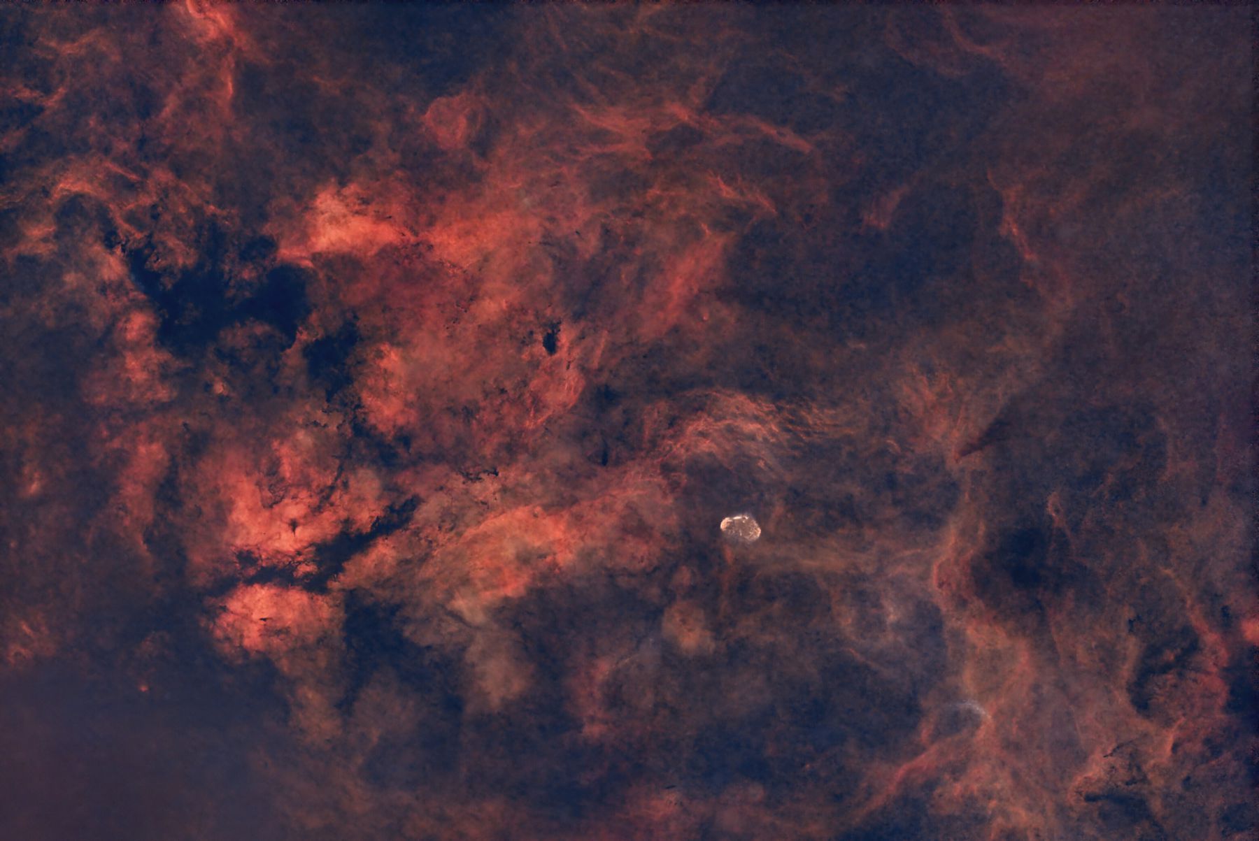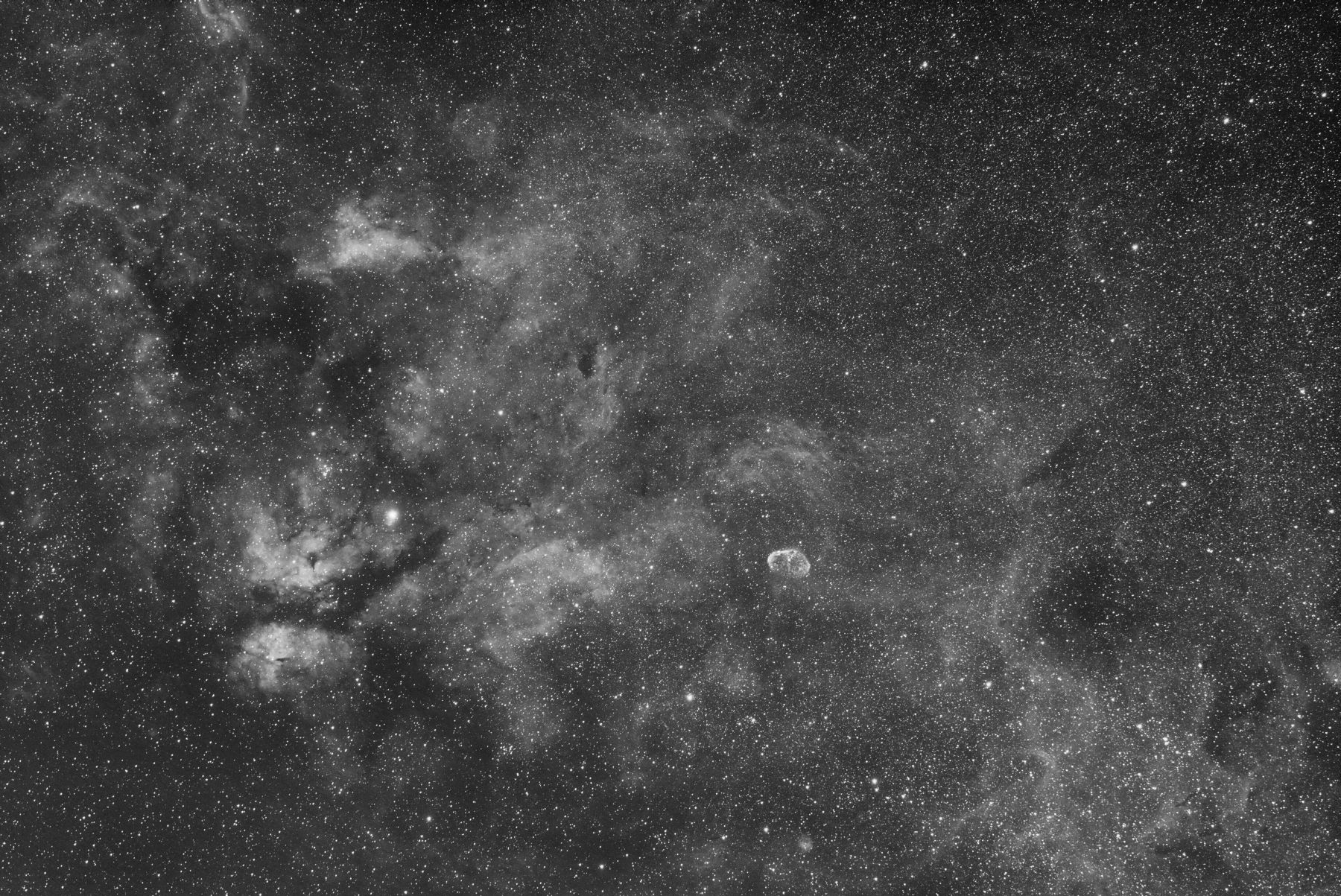 Here is a widefield image of the region around the star Sadr (γ Cyg) in the constellation of Cyngus, with Sadr being the bright star on the middle-left hand side. Also in the image, to the middle-right, is NGC6888 - the Crescent nebula.