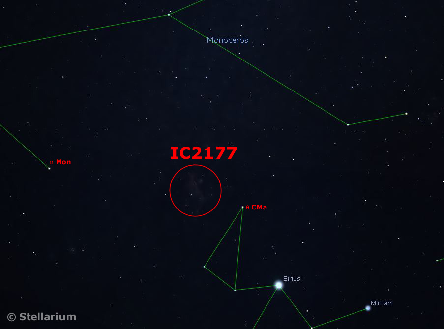 IC2177 - Seagull Nebula, is a large HII emission nebula, spaning over 240 light years across and about 3,800 light-years away. It lies on the border of Canis Major and Monoceros constellations, and is situated inside the Orion spur - ths same partial arm of the Mily Way as our own solar system.