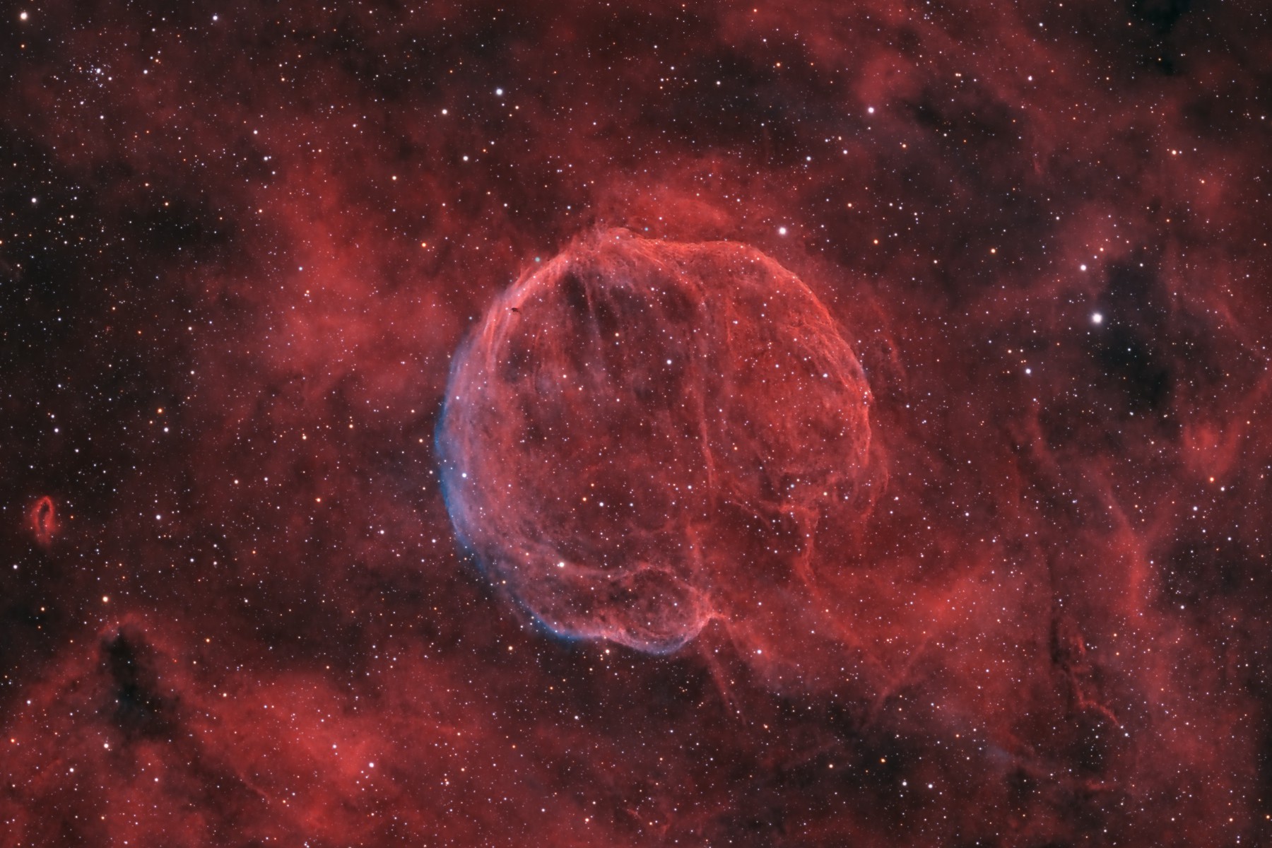 LBN576 (aka Abell-85, & CTB-1), is a very faint large supernova remnant in Cassiopeia, an emission nebula approx ½ ° across and 9,780 light-years from Earth. The bubble is still expanding at a rate in excess of 1000 km/s.
