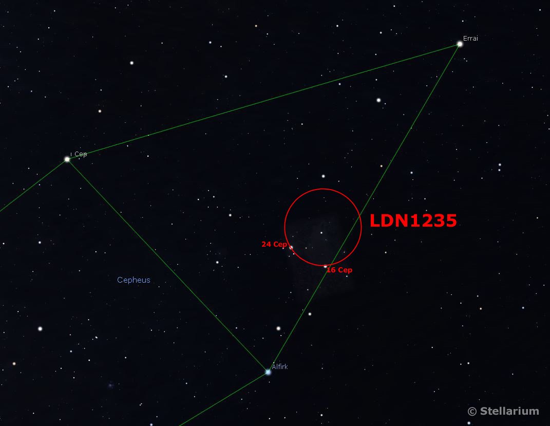 LDN1235 - the Dark Shark Nebula, is a dark nebula located in Cepheus. Strictly speaking the 'LDN1235' designation refers to the 'eye' region of the shark & other features such as the reflection nebula, which can be seen to the right, have other references.