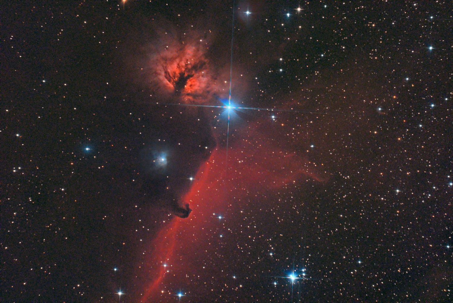 Also in the image are four reflection nebulae, NGC2023 and IC435 which lie below the Horsehead, plus IC431 and IC432 above the Flame Nebula.