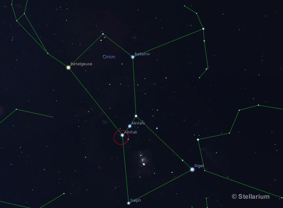 NGC2024 - the Flame Nebula is an emission nebula about 900 - 1,500 light years away. The brightest star in the image, Alnitak (ζ Ori), is the left hand star in the 'belt' of Orion and is actually a multiple star system dominated by a 1.79 magnitude B0 III supergiant. Ultraviolet lght from this star ionises the surrounding clouds of hydrogen gas, which then re-emits visible light when the ejected electrons recombine with the hydrogen atoms. The flame-like structure which is visible in the image is due to dust which obscures part of the nebula's view.