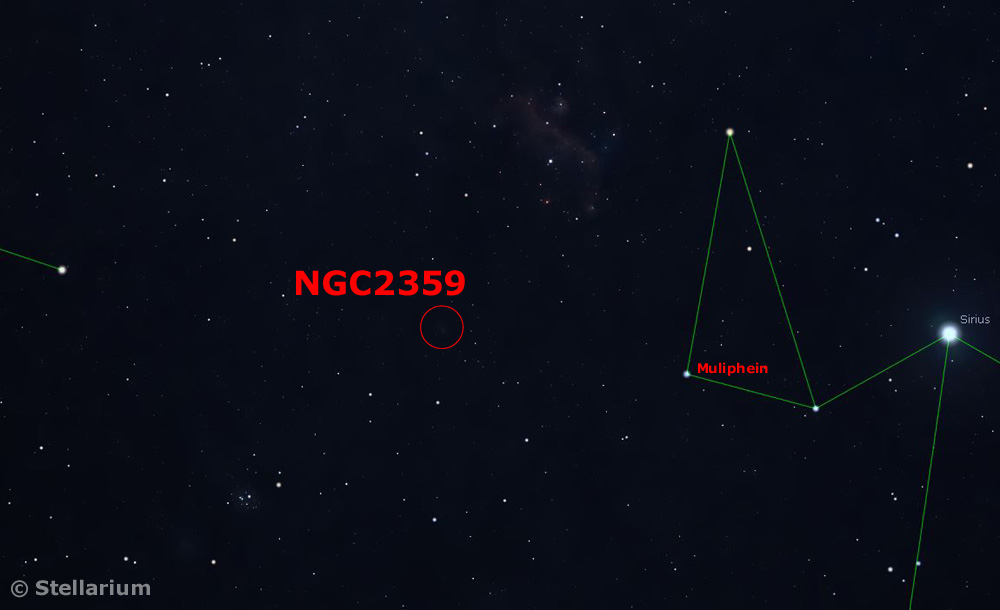 NGC2359 - Thor's Helmet Nebula is an emission nebula in the constellation of Canis Major. It lies about 12,000 light-years away and is 30 light-years in size. The central star in the nebula, is a Wolf-Rayet, which is an extremely hot star surrounded by circumstellar material it has previously ejected. The star is thought to be in a brief pre-supernova stage of it's evolution.