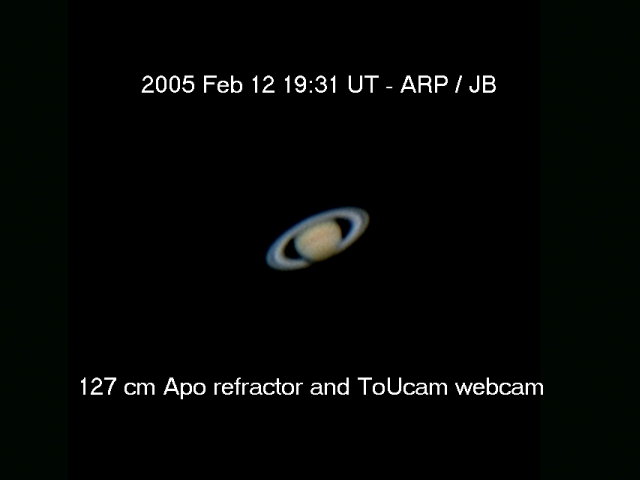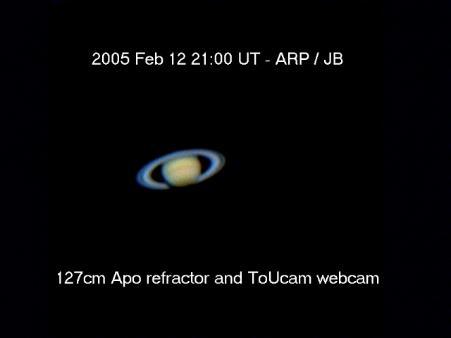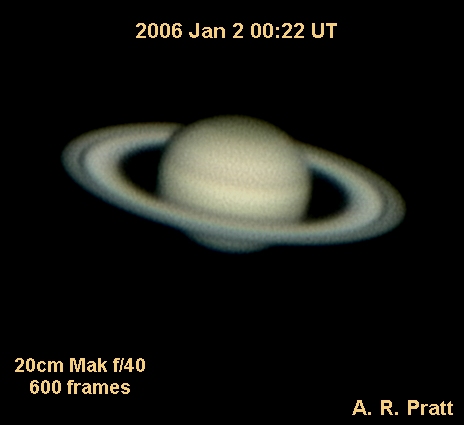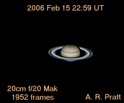 The pale yellow colour of the planet is due to ammonia crystals in its upper atmosphere, with wind speeds of up to 1,100 miles/hour. Beneath the clouds, it's thought that the planet has a core of iron-nickel surrounded by a deep layer of metallic hydrogen and a layer of liquid hydrogen & helium. Like Jupiter the planet has a very fast rotation rate (10.7 hours at the equator), but the banding in the atmosphere is not as conspicuous from Earth.