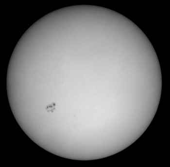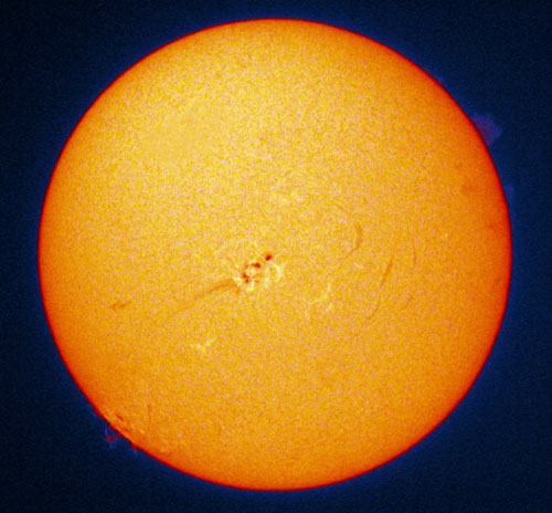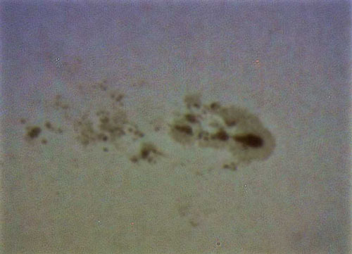 Sunspots can be seen on the sun as darker areas, where the temperature of the Sun's photoshere is about 2,000°C less than it's usual temperature (5,500°C). The spots are transitory, appearing and moving across the surface of the Sun, and are comprised of a darker inner region called the umbra and an outer higher temperature region called the penumbra.