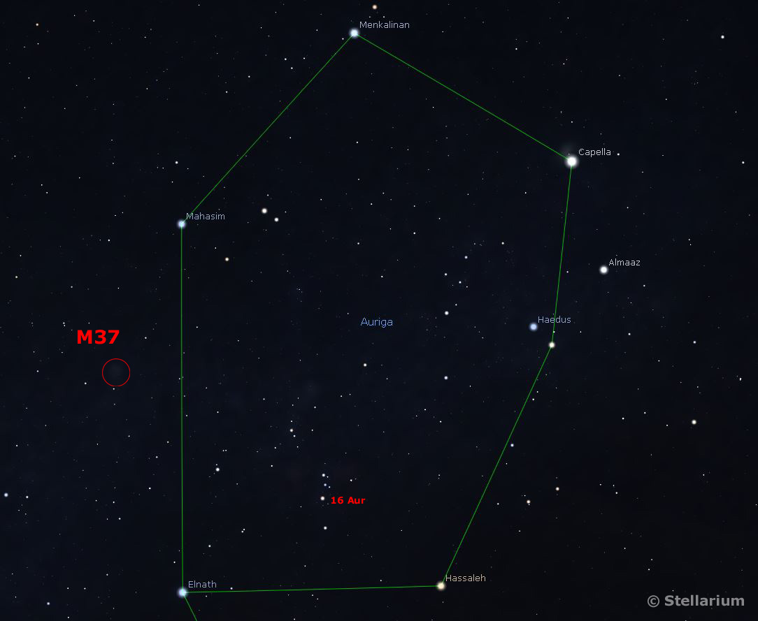 M37 is located about 7° from Elnath (β Tau) or 5° from Mahasim (θ Aur).