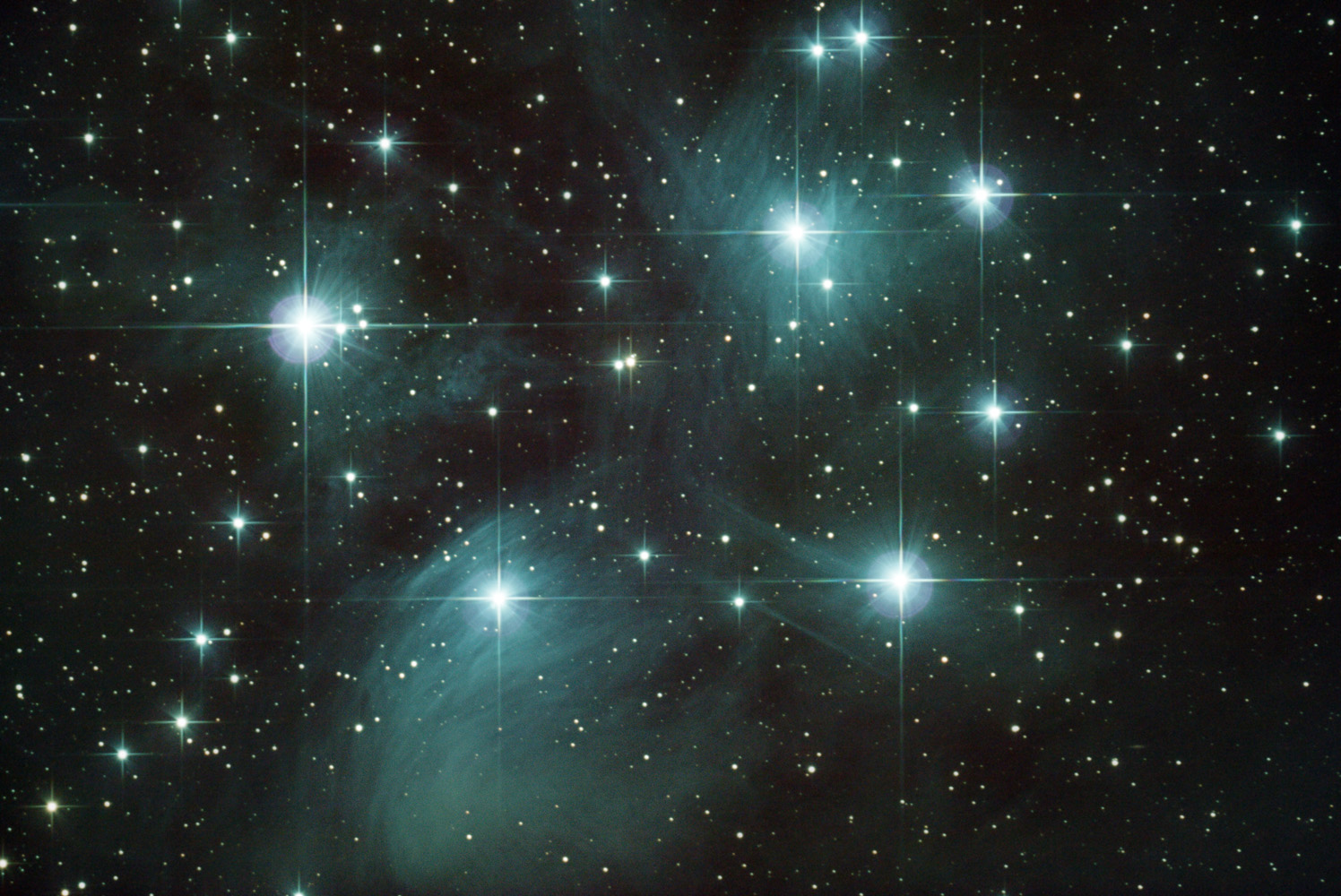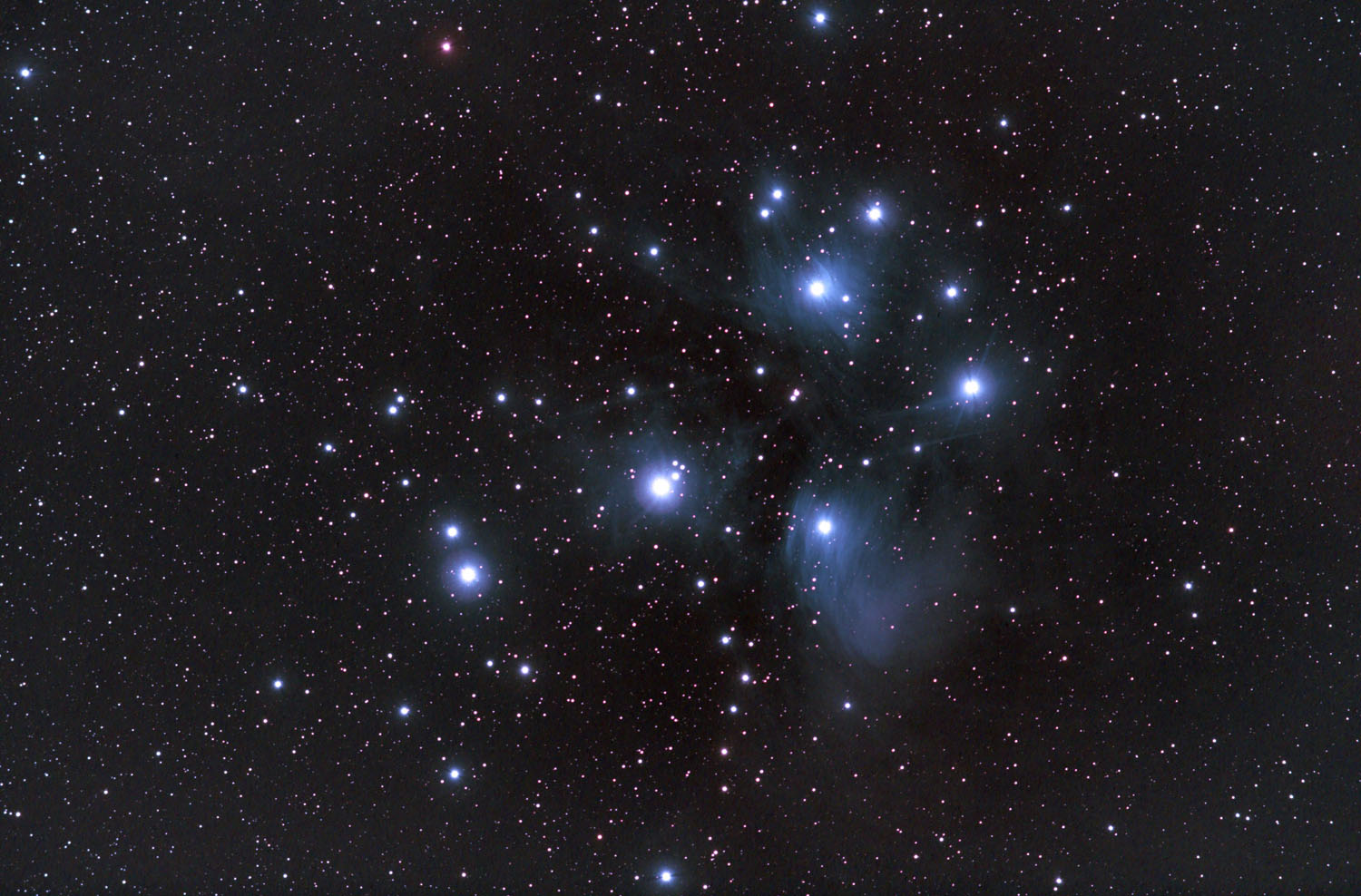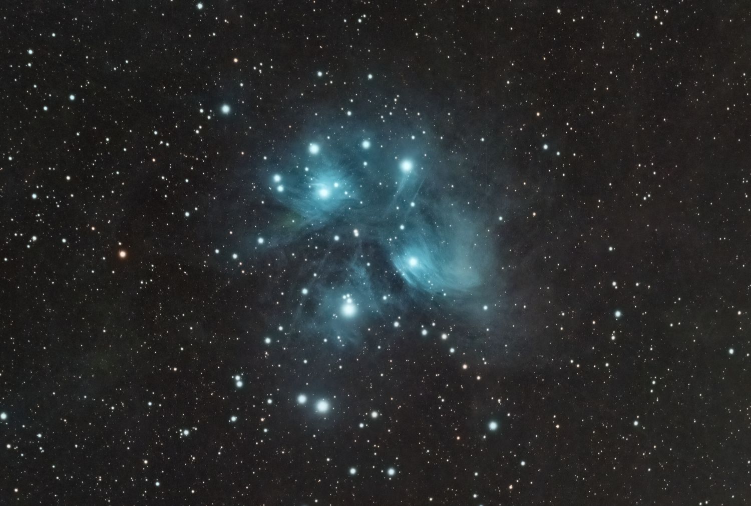 M45 - The Pleiades a.k.a the Seven Sisters is an spectacular open cluster associated with a reflection nebula. Nine of the brightest stars are named after characters from Greek mysthology:- Titan Atlas, Oceanid Pleione and their seven daughters (Alcyone, Merope, Electra, Maia, Celaeno, Taygeta & Asterope). Although dominated by these nine hot blue stars the cluster contains over 200 stars and was formed within the last 100 million years.