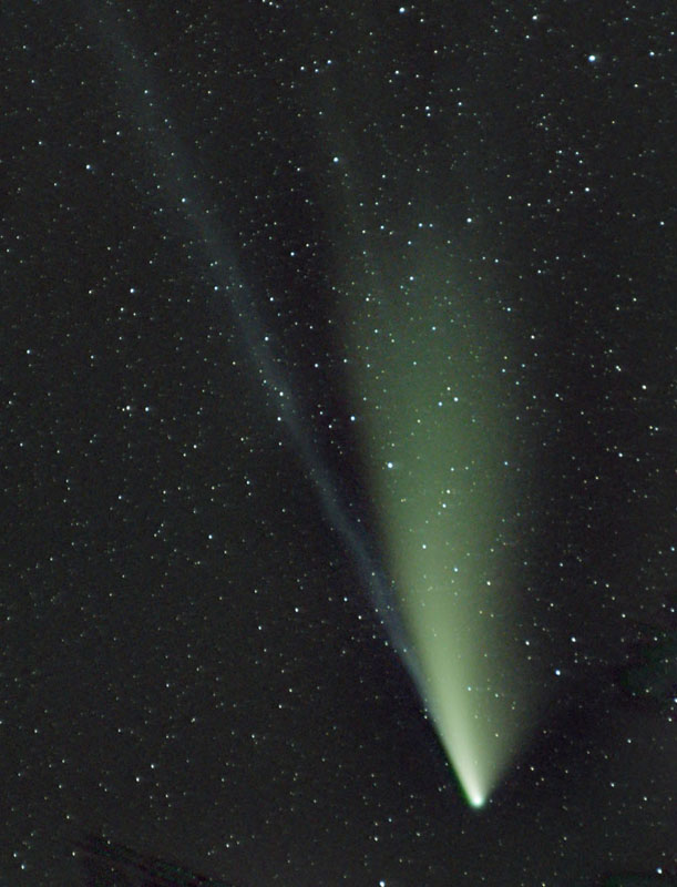 If the Comet moves closer to the Sun, it may develop a large visible tail of up to 1 AU long. The tail actually consists of two tails. There is a gas tail or an ion tail which appears to point away from the Sun, and a dust tail which lies behind the Comet in the wake of it's path.