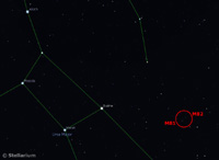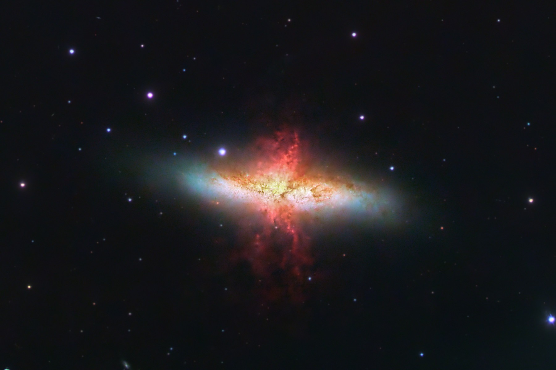 It's close neighbour, M82 - the Cigar Galaxy, gets it's name from it's edge-on appearance. It is a Seyfert 'star-burst' galaxy with it's central core being 100 times more luminous that the centre of our Milky Way. Images from Hubble identified 197 young massive clusters in it's core, each with an average mass of 200,000 times that of our Sun. The high rate of star formation is due to gravitational tidal action from M81.