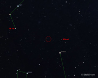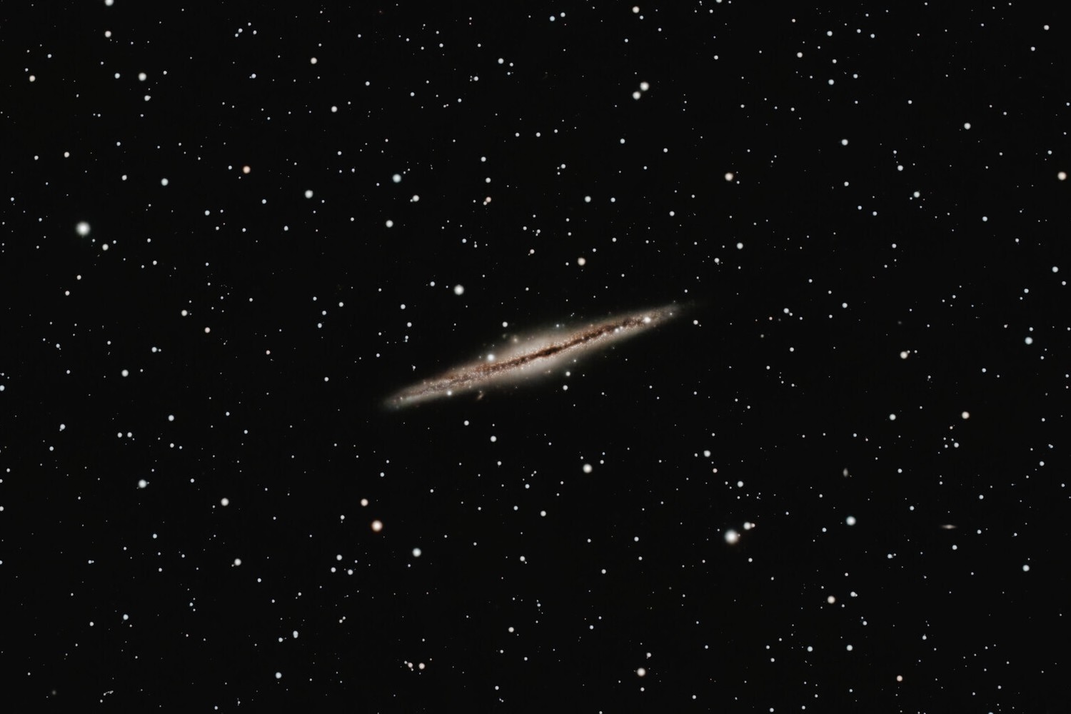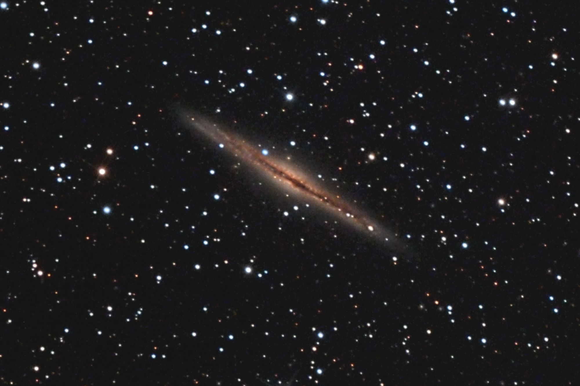 NGC891 is a spiral galaxy about 100,000 light years across & 30 million light years away in the constellation of Andromeda. From Earth it appears edge-on, with a splendid view of the dark lane of dust & gas running through its centre. The galaxy is thought to be about similar in size & luminosity to the Milky Way, and also like the Milky Way, it's thought to probably have a central bar.