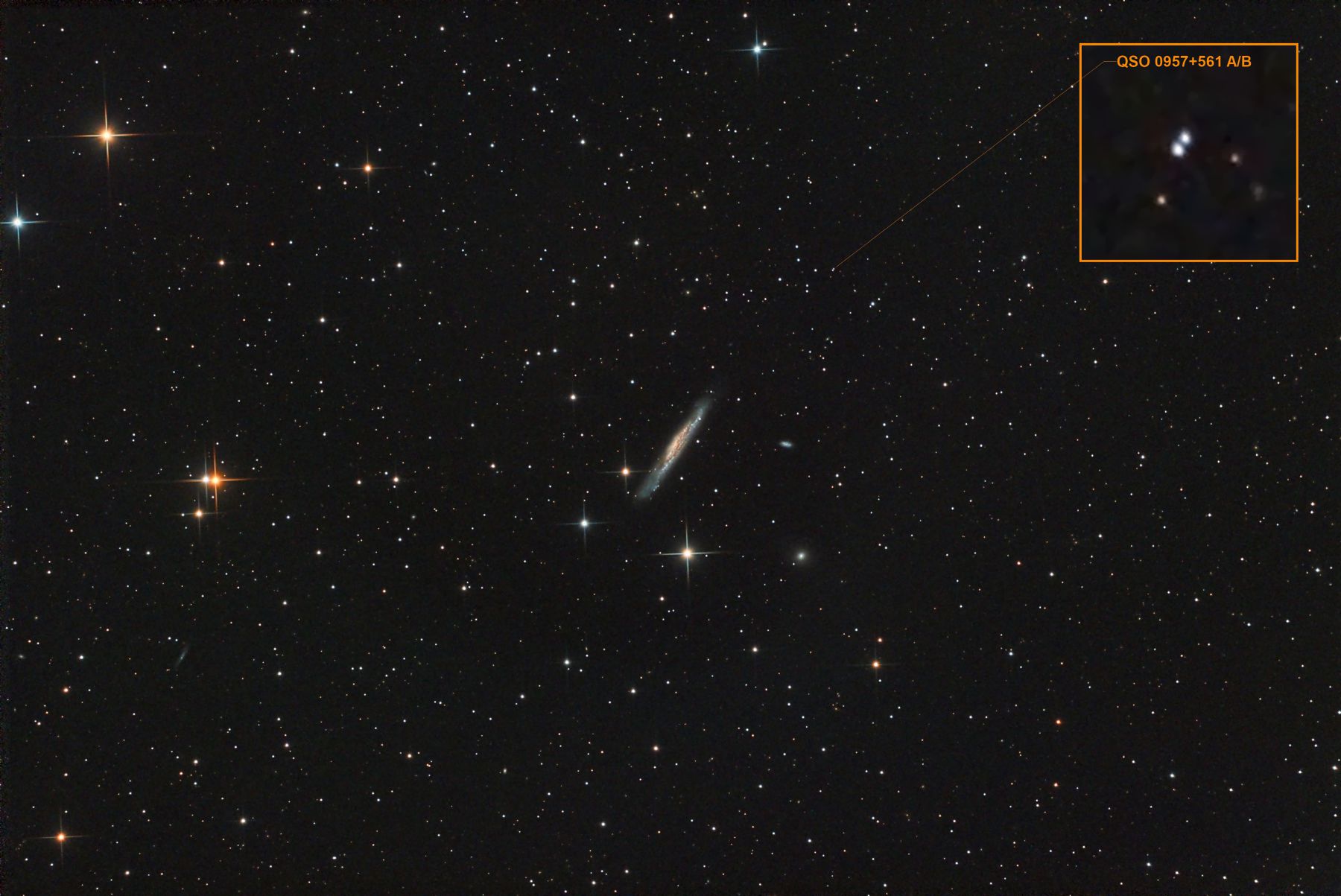 Also in the image are is the twin quasar QSO 0957+561 A/B. Although it looks just like a binary star, it is the first object to be identified as 'gravitationally lensed', which results in it appearing in double. There is a time delay of 417 days between each image and the quasar is approx. 8.7 billion light years away...
