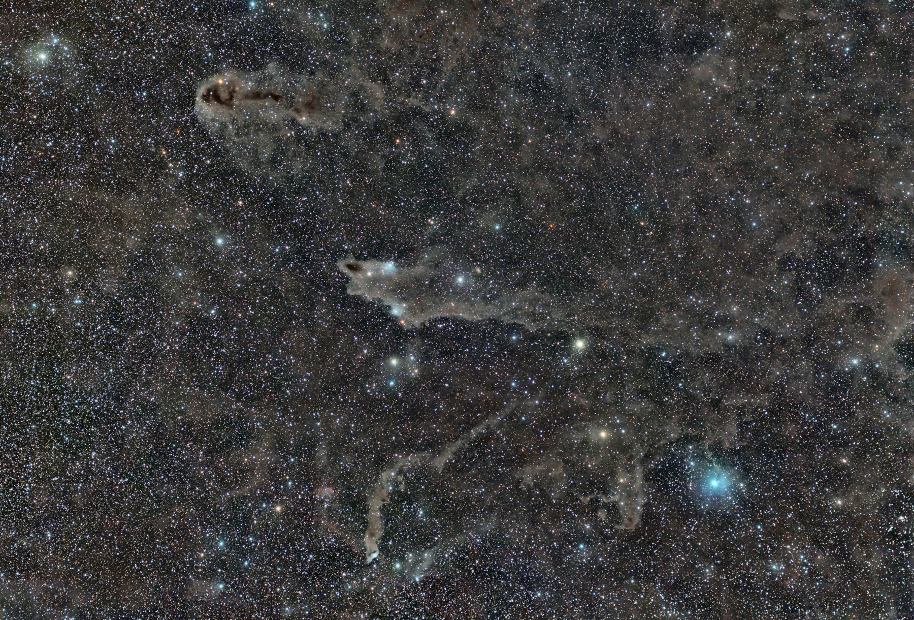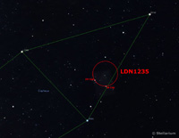 LDN1235 - the Dark Shark Nebula, is a dark nebula located in Cepheus. Strictly speaking the 'LDN1235' designation refers to the 'eye' region of the shark & other features such as the reflection nebula, which can be seen to the right, have other references.