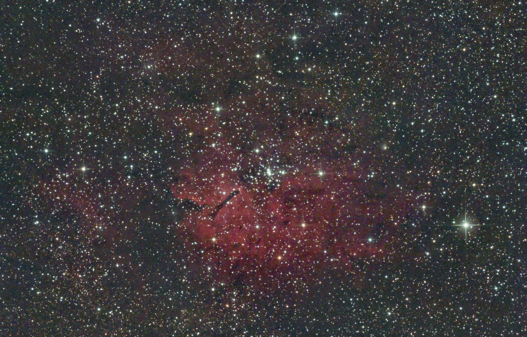 The dark line pointing to the bright central stars, is a huge pillar of dust which can be seen more clearly in this false colour APOD image.