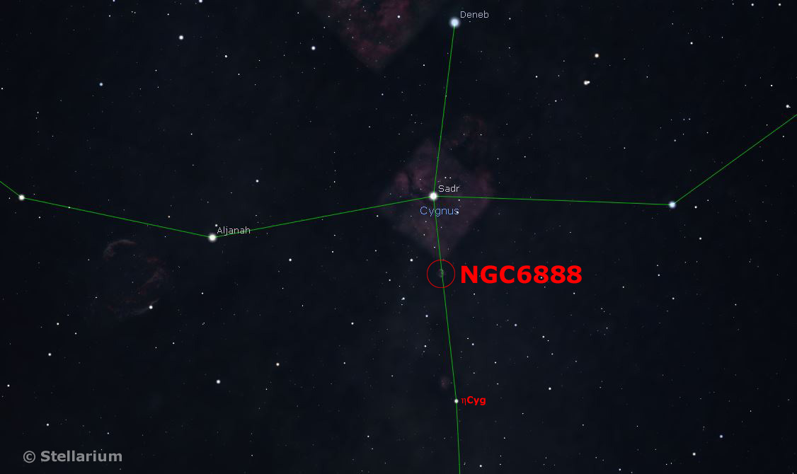 NGC6888 is an emission nebula about 5,000 light years away in the constellation of Cygnus, and about 25 light-years across.