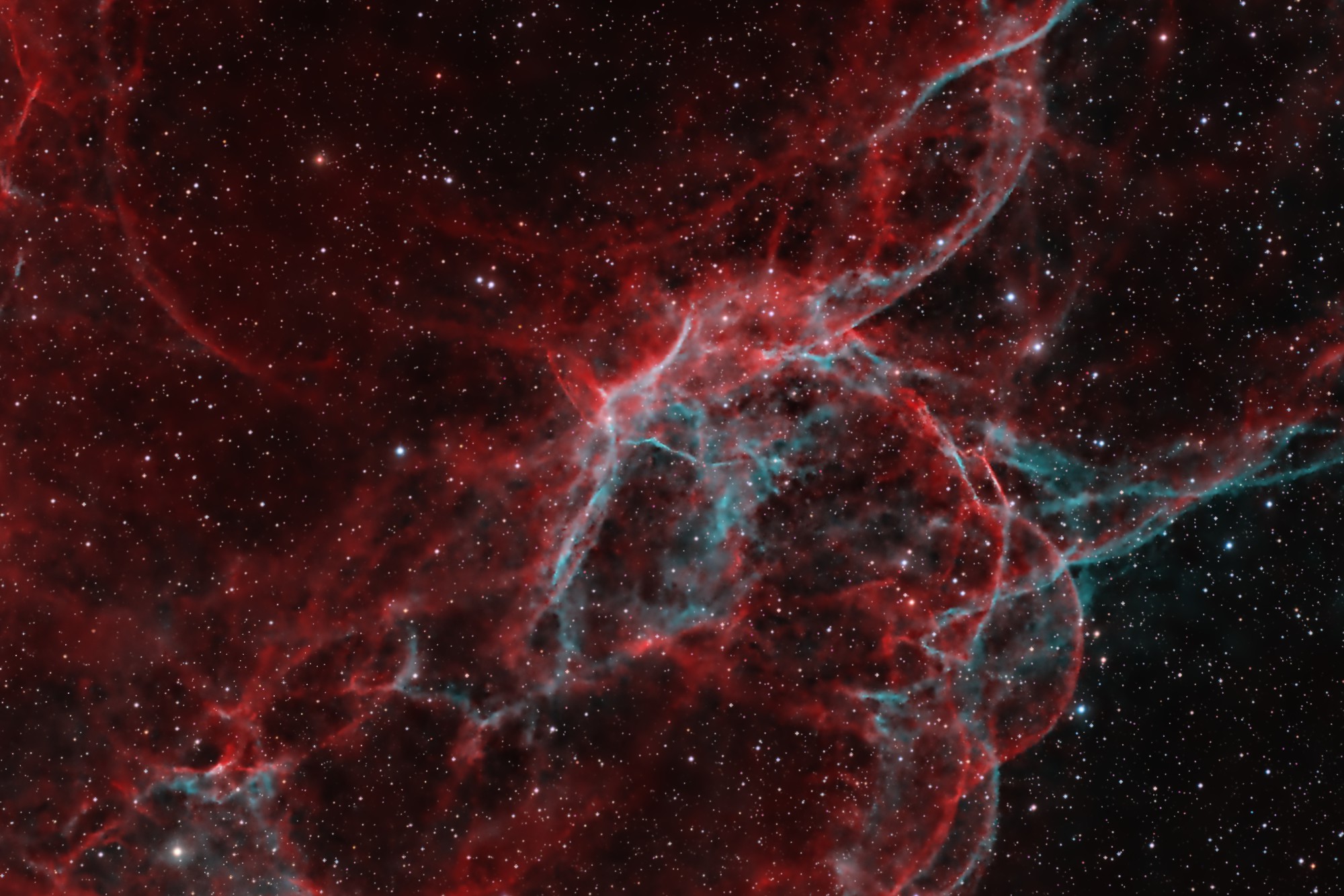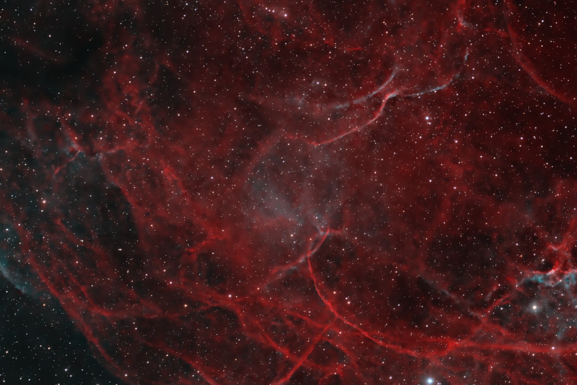 SH2-240 - the Spaghetti Nebula (also known as Simeis 147), is a very faint large supernova remnant on the border between Auriga and Taurus. It is approx 3 ° across and roughly 3,000 light-years from Earth. It was formed about 40,000 years ago when a large star went supernova. The explosion left behind a pulsar in the nebula core which emits a strong radio signal.