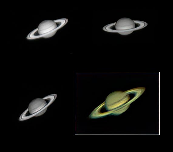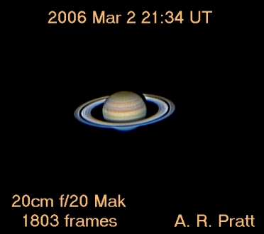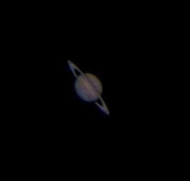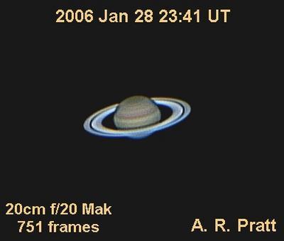 The pale yellow colour of the planet is due to ammonia crystals in its upper atmosphere, with wind speeds of up to 1,100 miles/hour. Beneath the clouds, it's thought that the planet has a core of iron-nickel surrounded by a deep layer of metallic hydrogen and a layer of liquid hydrogen & helium. Like Jupiter the planet has a very fast rotation rate (10.7 hours at the equator), but the banding in the atmosphere is not as conspicuous from Earth.