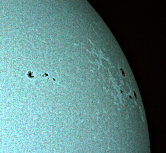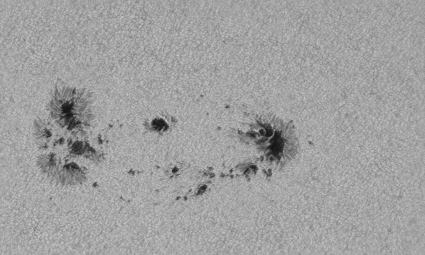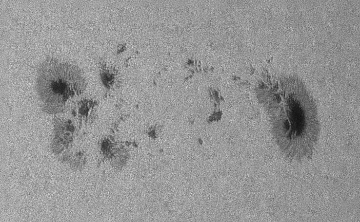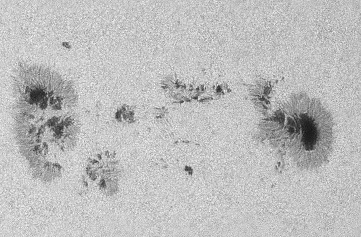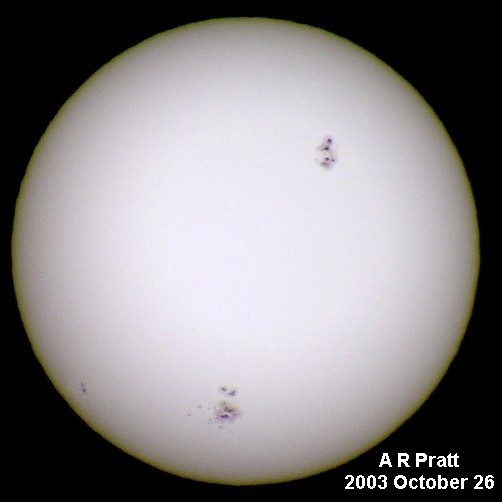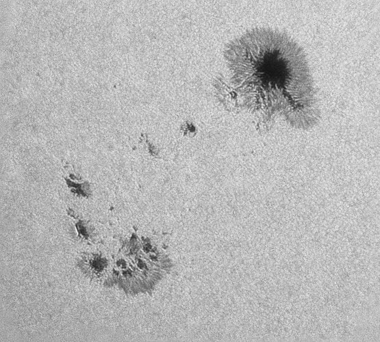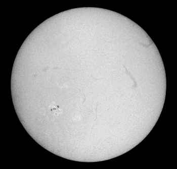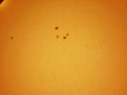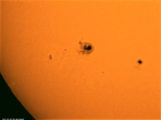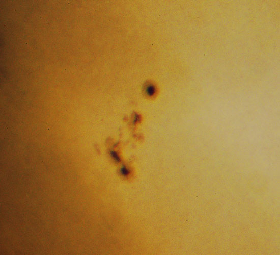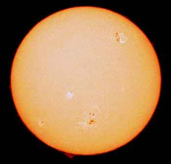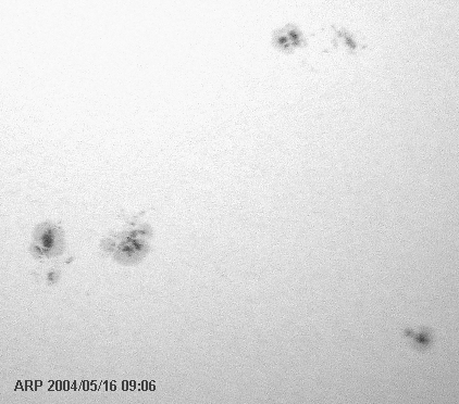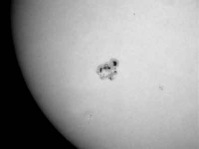 Sunspots can be seen on the sun as darker areas, where the temperature of the Sun's photoshere is about 2,000°C less than it's usual temperature (5,500°C). The spots are transitory, appearing and moving across the surface of the Sun, and are comprised of a darker inner region called the umbra and an outer higher temperature region called the penumbra.